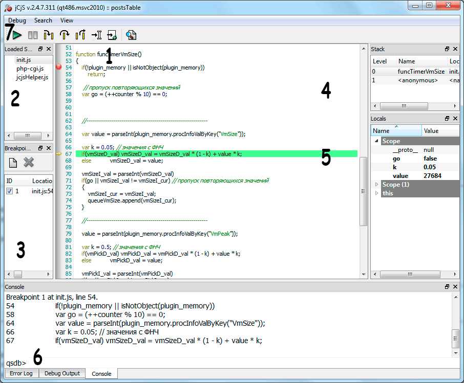 | 1 | Окно отладчика |