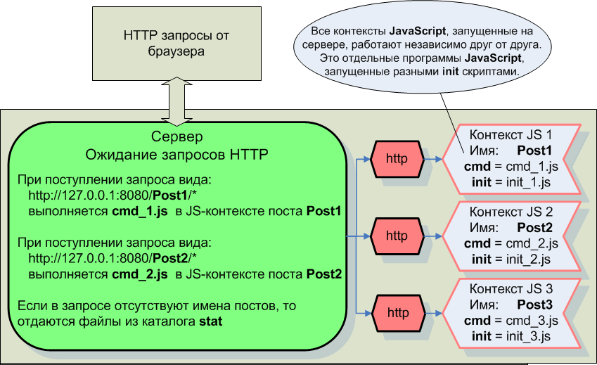 После того, как вы открыли браузер и ввели в адресную строку URL, браузер инициализирует соединение с сервером jCjS по протоколу HTTP. Как только содинение становиться установленным (established), server создает объект http, и если в первой директории встречается имя поста, передает созданный объект post-у. Пост принимает объект соединения, внедряет его в свой JS-контекст и выполняет коммандный скрипт cmd.js, задача которого обслужить запрос и ответить браузеру. Следующий схематический рисунок поясняет как это происходит.